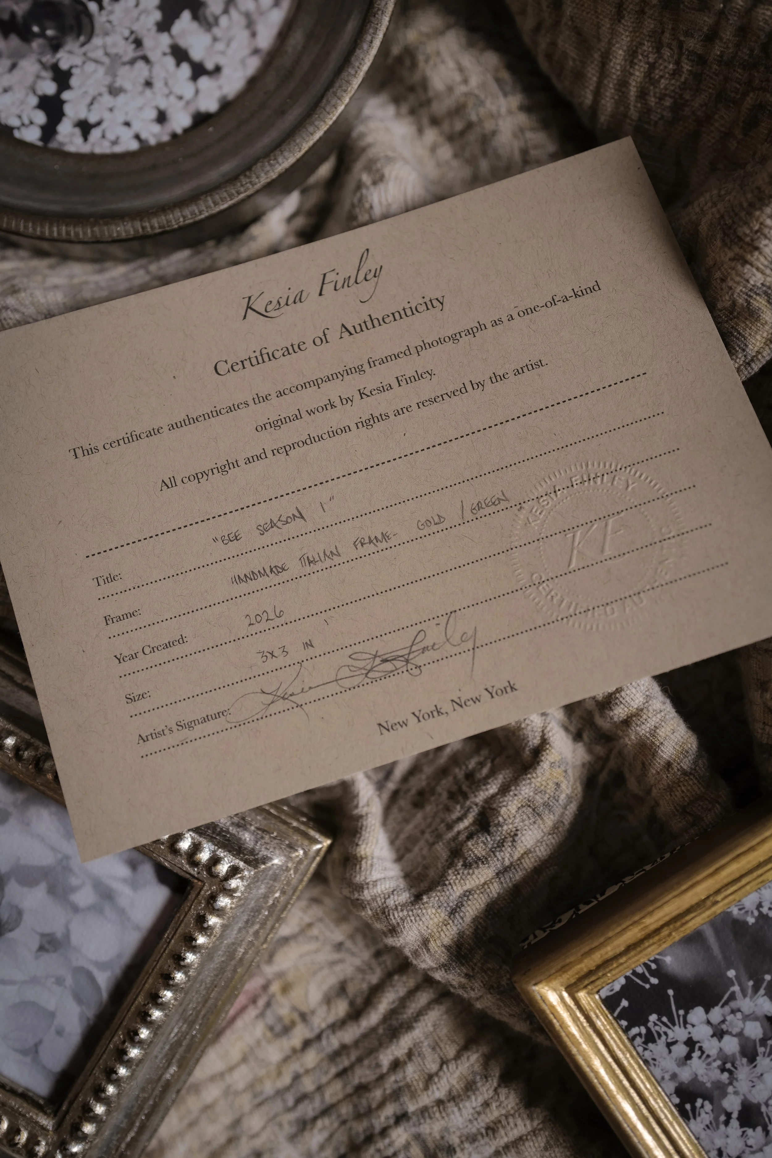 This is a one-of-a-kind original photo taken by Kesia. Hand cut. Framed in a handmade easel-back Florentine frame under glass. Photograph is printed on heavy matte 100% cotton Fine-Art German rag paper. The rich texture of the paper, and the handmade imperfections of the frame, give a gorgeous vintage feel to the piece.